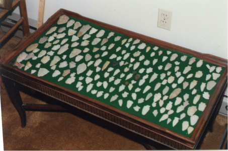 The Manahoacs were Siouan speaking Indians who originated in the Ohio Valley. They occupied the area in Stafford above the Rappahannock fall-line to the Blue Ridge Mountains. It is thought they numbered only 1,500. These were the Indians Captain John Smith encountered during his trip up the Rappahannock River in 1608. Smith spent the night on Belmont Hill with this tribe. (The exhibit shows a wide variety of projectile points that were used with throwing sticks (atalatls), spears, and arrows.) Blaisdell Collection, Stafford County Historical Society - SCHS